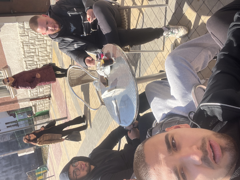 The image depicts an outdoor cafe scene on a sunny day in the city of Chepelare, Bulgaria. Three men are seated at a round, metallic cafe table in the foreground and mid-ground. The closest individual, partially visible on the left, is a young adult male with a buzz cut and stubble, wearing a black hooded sweatshirt, actively taking the photograph. To his right, another young adult male with dark hair, glasses, and a black hooded sweatshirt is seated, smiling slightly. Opposite him, on the right, a third young adult male with short light brown hair is seated, wearing a black puffer jacket over a graphic t-shirt, black tracksuit bottoms, and light-colored sneakers. He holds a white object, possibly a cigarette or vape pen, in his right hand, with a black fanny pack slung across his chest. The table holds a white napkin dispenser, a dark-cased smartphone, a white coffee cup and saucer, and a glass containing a dark beverage with ice and a lemon slice. The chairs are light-colored woven material with metal frames. In the background, two adult women are visible on a multi-colored tiled sidewalk. The woman on the left wears a light brown puffer jacket, dark trousers, and carries a black handbag, walking towards the right. The woman on the right wears a long maroon puffer coat over dark clothing and is standing, looking towards the cafe. Behind them is a building with a light-colored facade featuring a textured relief pattern, and an orange-red roof is visible further back. Strong sunlight casts distinct shadows across the paved area.