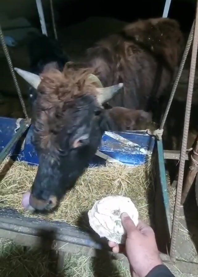 person offering a white, round object to two different cows in separate enclosures. Both cows are brown and black, with short horns. The person's hand, wearing a dark sleeve, holds the object close to the cow's mouth, and in both instances, the cow appears to take the object from the person's hand. The enclosures have metal frames, and the cows are standing on beds of hay. The environment is dimly lit.