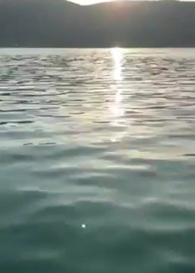 person wearing black sneakers and light-colored pants sitting with their legs dangling over the edge, presumably on a pier or dock, overlooking a body of water. The water reflects sunlight, and in the distance, there are hills and a coastline with buildings visible. The sky is clear with a few scattered clouds.