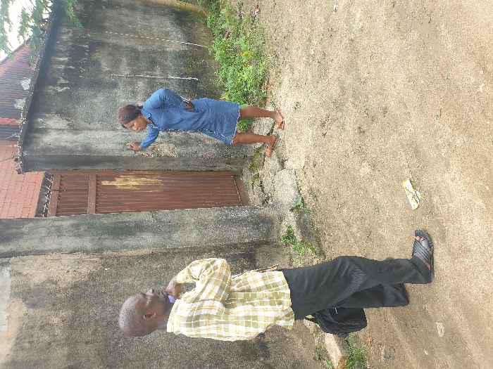 The image depicts an outdoor scene in Aba, Nigeria, featuring two adult individuals positioned near a weathered concrete wall and a rusty metal gate