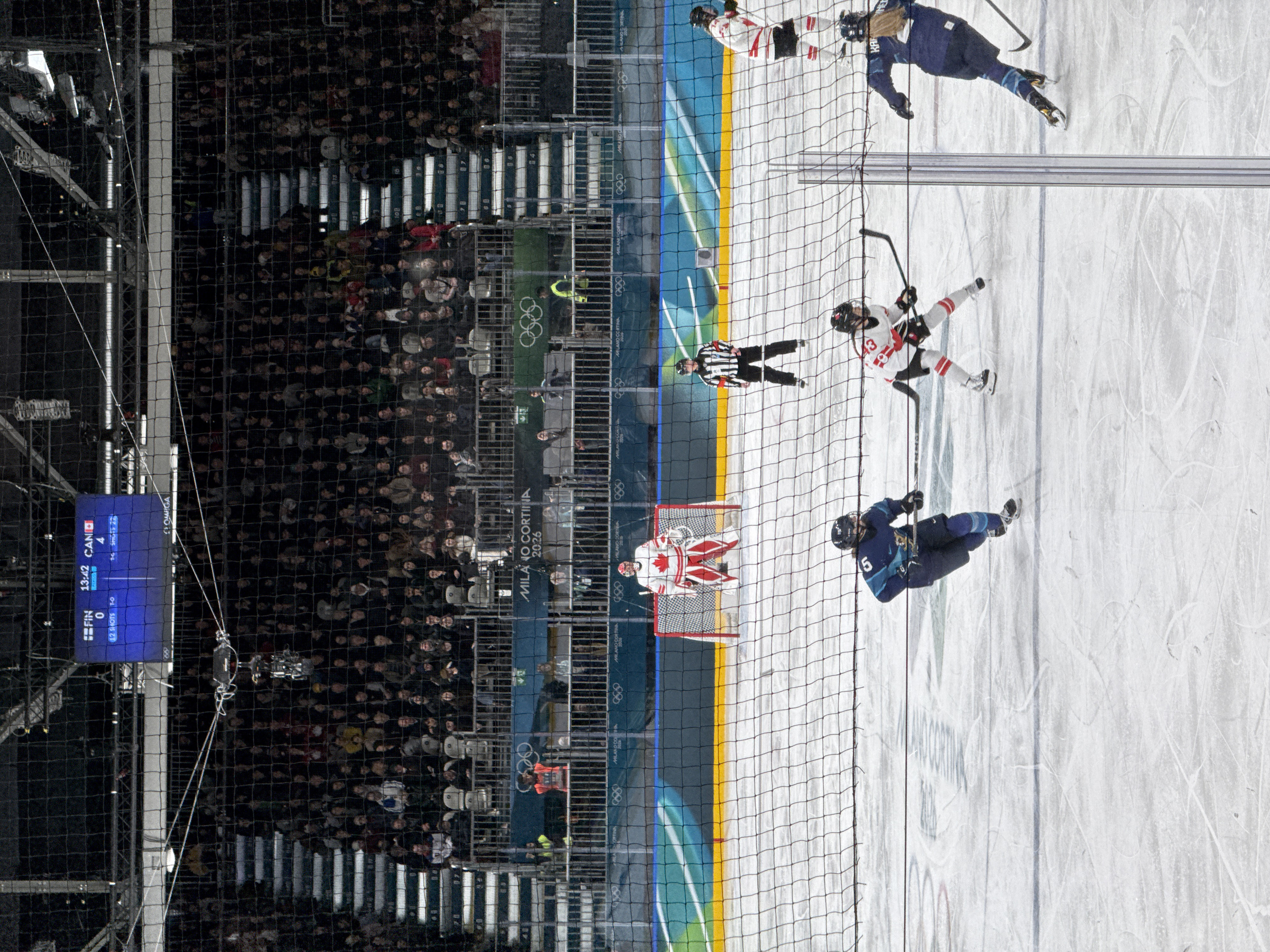 An ice hockey game is depicted within an indoor arena located in Rho, Italy, with branding for "MILANO CORTINA 2026" visible. The image is captured from an elevated position, looking down through a black protective netting onto the ice rink. The scoreboard displays "FIN 0" with "12 SHOTS 7-0" and "CAN 4" with "SHOTS 2-0," indicating a score of 4-0 in favor of Canada with 13 minutes and 42 seconds remaining. An "OMEGA" logo is also present on the scoreboard. On the ice, a Canadian goaltender in white and red protective equipment stands positioned in front of a red-framed goal. A referee in a black and white striped jersey stands near the goal. Three additional players are actively engaged: one player, number 5, in a dark blue jersey with light blue detailing, skates towards the left; another player, number 13, wearing a white and red jersey, skates forward holding a hockey stick; and a third player, number 42 with the name "KÄRMINE" visible on the back of a dark blue jersey, skates away from the viewer. All players wear helmets and skates. Above the ice, a cable-suspended camera system is visible. The multi-tiered spectator stands are significantly occupied by a crowd of individuals. Banners featuring the "MILANO CORTINA 2026" logo and the Olympic rings are positioned along the perimeter of the ice, beneath the lower seating sections. Arena staff wearing high-visibility orange and yellow vests are present in the lower spectator areas. The ice surface displays numerous skate marks.