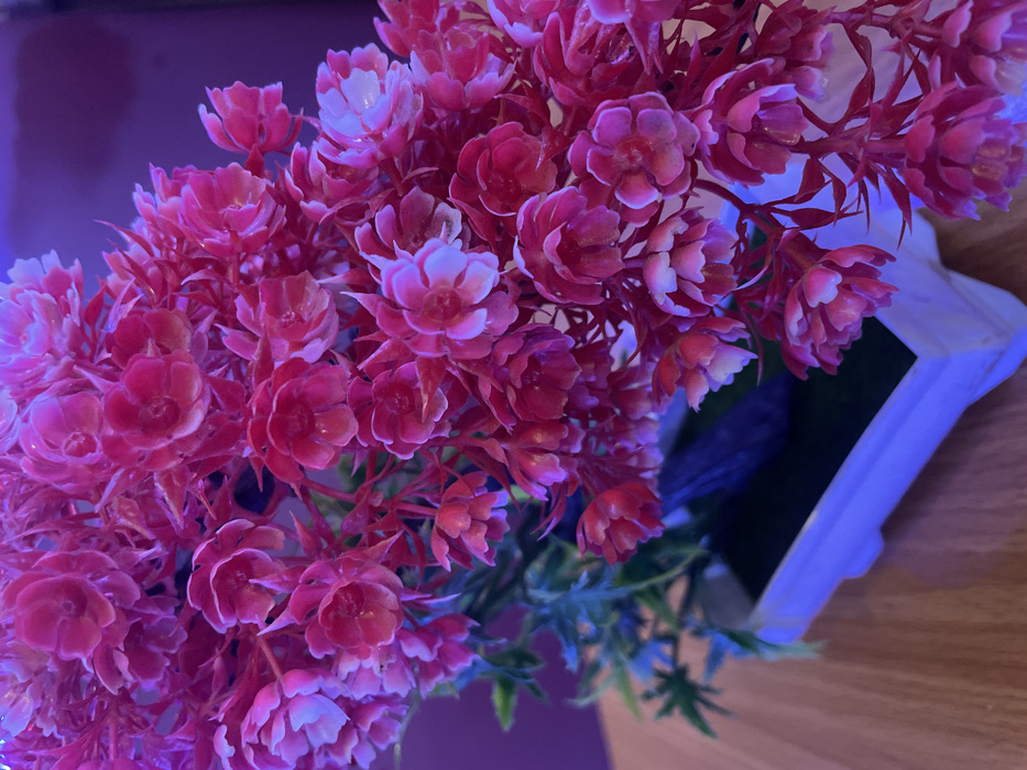 This image, taken in Bukuru, Nigeria, presents a close-up view of an artificial floral arrangement. The central subject is a dense cluster of numerous small, reddish-pink flowers with individual petals showing lighter pink to white edges and centers. Dark green, pointed foliage is interspersed among the flower clusters and visible near the base of the arrangement. The flowers are contained within a white, rectangular pot or planter, which sits on a light brown, wooden surface exhibiting visible grain. The immediate background is a blurred, solid purple or magenta hue, suggesting an indoor setting with colored lighting. The scene is illuminated by artificial light, imparting a distinct bluish-purple cast to the white pot and green leaves, while enhancing the vibrant pink tones of the flowers. No people, discernible actions, or interactions are visible.