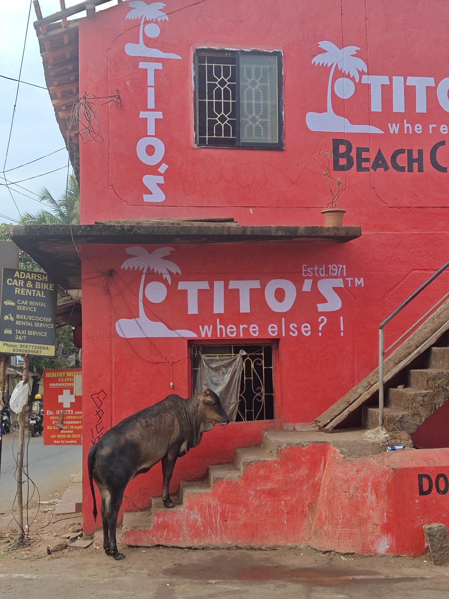 Here is a description of the image: The photograph shows the exterior of a two-story building in Arambol, India. The building is painted a vibrant red and features white painted logos of "TITO'S", including "Beach Cafe" and "where else?!", along with a stylized palm tree motif. The upper story has a window with metal bars. A staircase leads up to a doorway on the first floor, where a cow stands. To the left of the building, a sign advertises "ADARSH CAR & BIKE RENTAL," offering car, bike/scooter, and taxi services. Another sign advertises "HEALTHY WENT CLINIC", listing the services and contact information of "Dr. STJTI."
