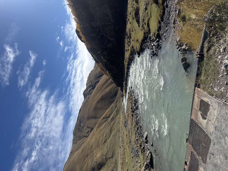 The image depicts a panoramic view of a river valley in Kvemo Okrokana, Georgia, under a partly cloudy blue sky. A milky, pale turquoise river with significant rapids flows from the distant background towards the immediate foreground, occupying the central and lower-mid sections. Its banks are characterized by dark rocks and sparse, dry grass. To the left of the river, large, rounded mountains with slopes covered in yellowish-brown dry grass dominate the landscape, extending into the background. A small, white, rectangular structure is visible high on the left mountain slope. A dirt track or unpaved road runs parallel to the river on the left bank, flanked by several wooden utility poles with visible wires extending into the distance. The terrain adjacent to this track is relatively flat and grassy. To the right of the river, a darker, steeper mountain slope, partially in shadow, rises sharply. The upper part of this slope is adorned with evergreen trees and deciduous trees exhibiting yellow and orange autumn foliage. In the immediate foreground, a dark, flat, metallic or concrete structure with embossed rectangular patterns is visible on the lower left, extending partially over the river's edge. On the lower right, a dark pipe runs horizontally along the grassy bank before disappearing towards the river. The sky above is bright blue with scattered, wispy white clouds. No people or animals are visible.