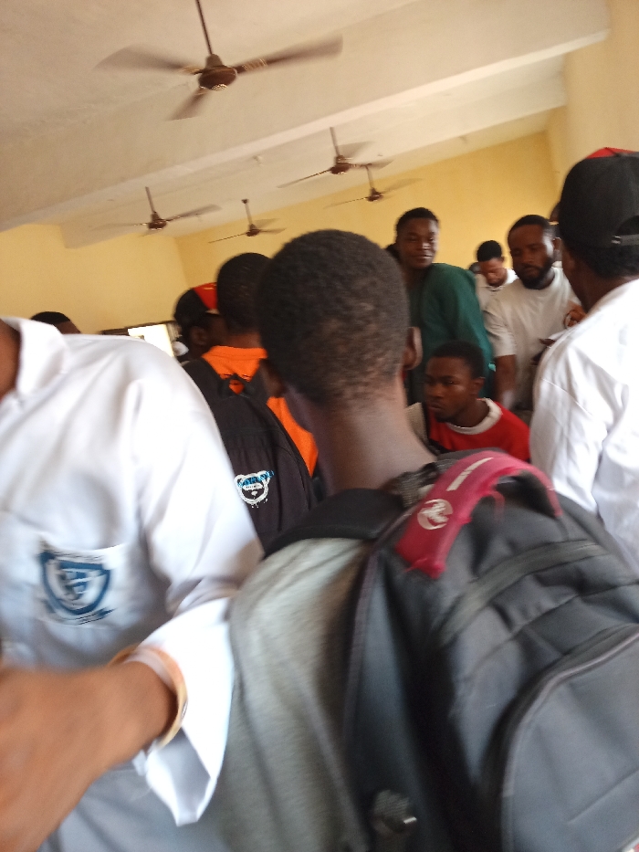 A crowded indoor space shows several individuals, mostly men, in casual attire. Ceiling fans are visible above the group. One person wears a white shirt with a logo, another has a backpack. Some individuals stand further back in a lighter-colored area, while the foreground is more densely populated. Colors like white, orange, and red are prominent in the clothing. The view is from within the crowd.