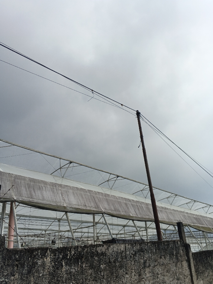 A grey sky looms above a weathered concrete wall, partially obscuring a long greenhouse structure with a white, semi-transparent covering. Overhead, electrical wires are strung along a dark, aged pole. The pole, positioned at an angle, intersects the greenhouse roofline. The wires display loose segments and irregularities, suggesting potential disrepair or damage. The overall mood is overcast and possibly damp.