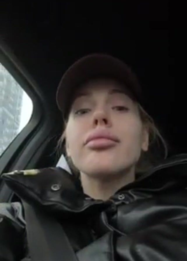 A woman with blond hair wearing a brown Ralph Lauren baseball cap and a black puffer jacket is in a car. She is wearing a seatbelt. She makes a pouting face, then sticks her tongue out. A tall building is visible through the driver's side window.