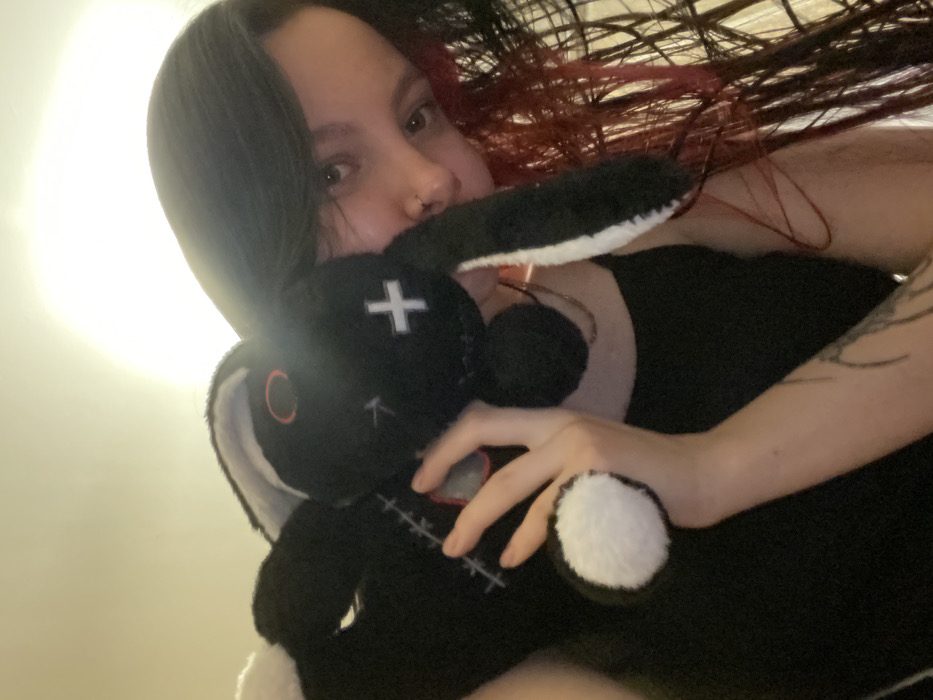 A close-up, high-angle indoor photograph captures an individual holding a black plush rabbit