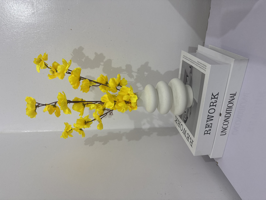 An artificial floral arrangement is positioned in the corner of a room within Aviation Quarters, Nigeria. A white, textured, three-tiered ceramic vase holds multiple stems of bright yellow, five-petalled artificial flowers. The flowers fan out from the vase, extending upwards. The vase rests on two stacked white decorative books. The top book displays "REWORK" in black text, with a black and white photograph underneath depicting two individuals. The bottom book reads "UNCONDITIONAL" in black text. The arrangement is situated on a light-colored, flat surface against two intersecting plain, light-colored walls. Shadows of the flowers and vase are cast onto the walls behind them, indicating a light source from the upper left. No people are present in the scene.