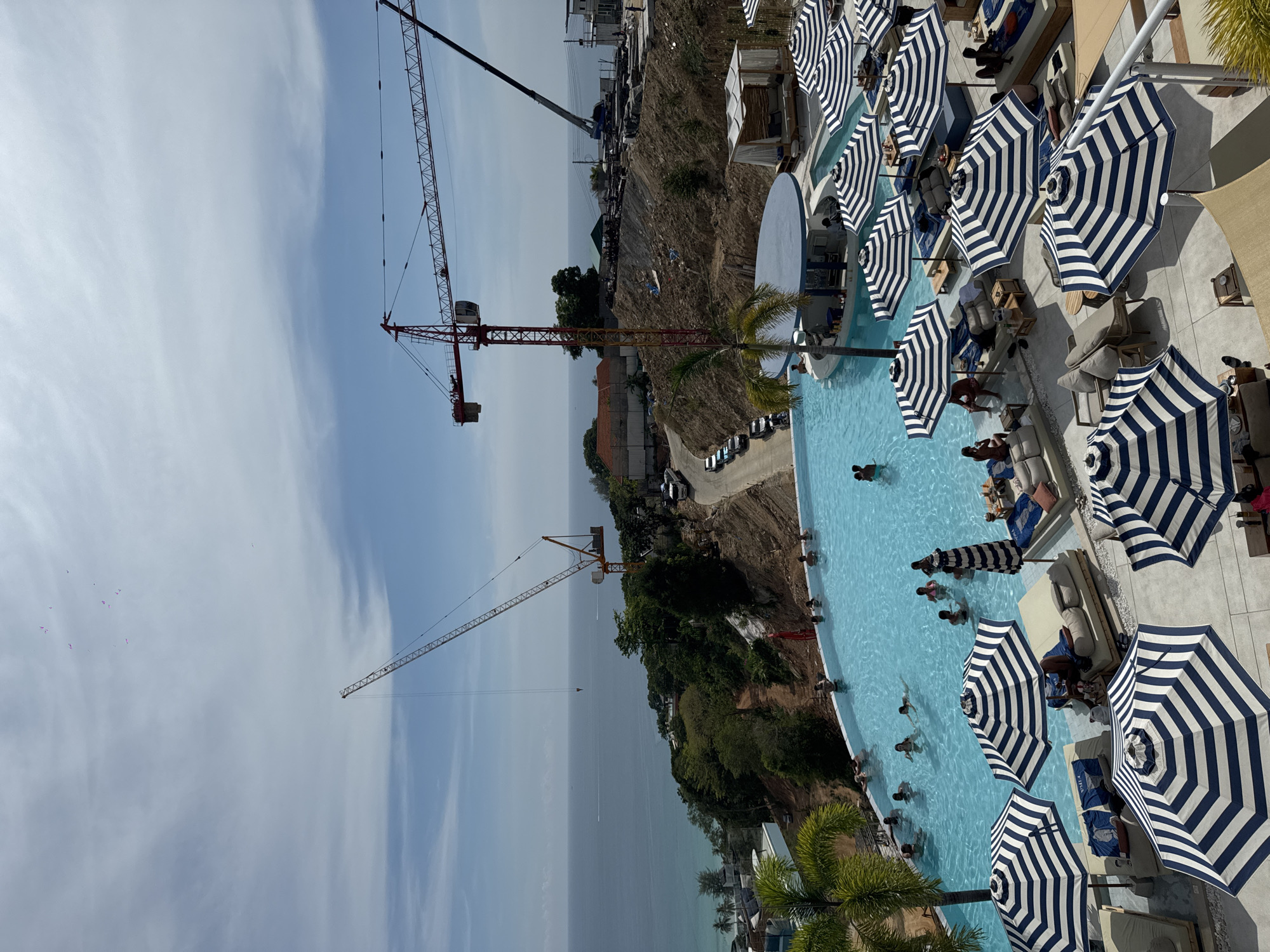 rooftop pool area overlooking the ocean, likely in Karon, Thailand. The pool is long and rectangular, filled with people swimming and wading. Blue and white striped umbrellas provide shade to lounge chairs and tables surrounding the pool. Palm trees are visible near the pool area. In the background, there is a construction site on a hillside with three large red and white cranes. A road with parked cars is visible below the construction. The ocean stretches out to the horizon, with a cloudy sky above.