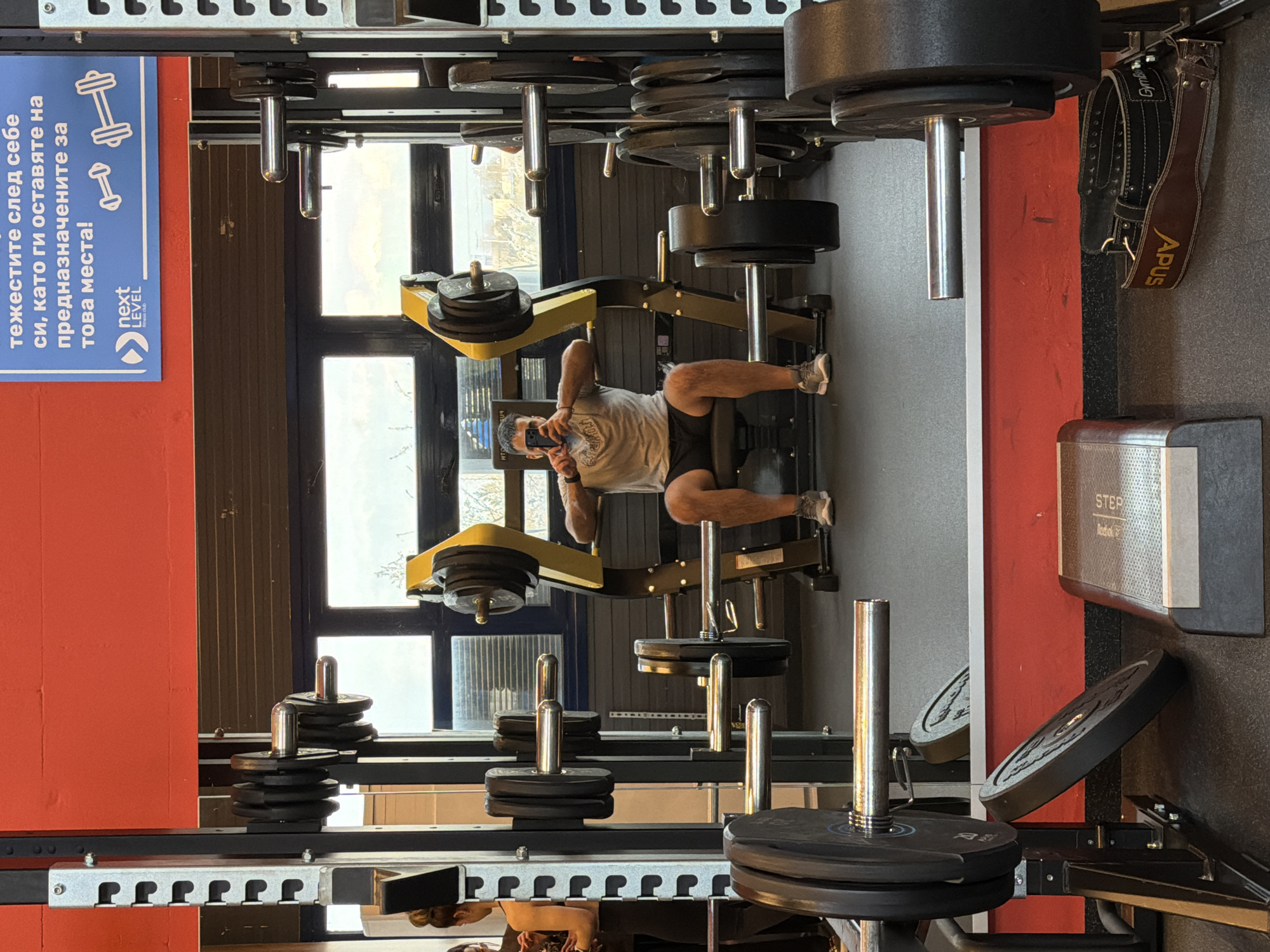 n interior gym setting likely in Sofia, Bulgaria based on the Cyrillic text on a sign. A man is seated on a weight machine, possibly using his phone. Various gym equipment including weight racks, weight plates, a weightlifting belt labeled "APUS," and a "Reebok STEP" are visible. The scene is well-lit, with natural light entering through windows in the background. The gym walls are painted red and gray. The overall setting is that of a modern, well-equipped fitness facility.