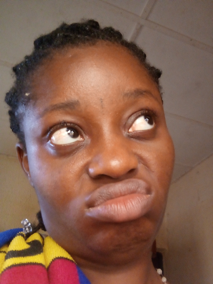A close-up portrait shows an adult female with a dark complexion, featuring dark hair styled in small braids or twists. Her eyes are rolled upward, with the pupils mostly obscured by the upper eyelids, and her mouth is pursed. A multi-colored garment, displaying blue, yellow, black, and red stripes, is visible over her left shoulder and chest. A clear, possibly beaded, ornament is present near her left ear, and a white beaded necklace is partially visible on her right side. The background is an indistinct indoor setting, revealing a plain, light-colored wall and a white paneled ceiling. The location is Unknown, Unknown.