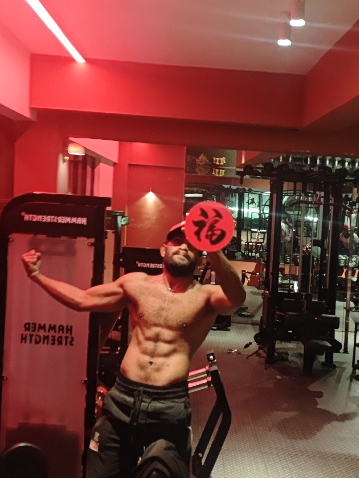 This image captures a shirtless adult male posing within a gymnasium located in the Chongqing High-tech Zone, China