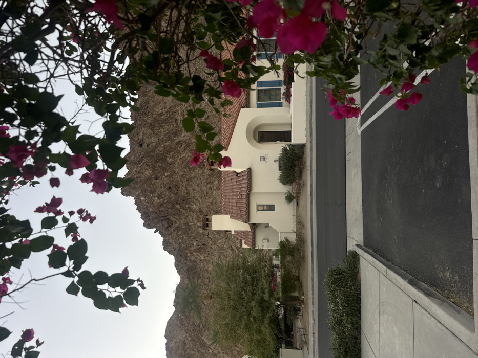 This image displays a residential street in La Quinta, United States, showcasing a property identified by the address 77752. The central subject is a cream-colored stucco house featuring a red terracotta tile roof, multiple chimneys, an arched wooden main entrance, and windows with blue louvered shutters. An outdoor air conditioning unit is visible near the house's front. The residence is positioned opposite a dark asphalt street, which includes a concrete sidewalk and a paved parking area marked with two faint white lines. Landscaping in front of the house and along the street consists of various green shrubs and low vegetation. To the left of the house, a tall palm tree and a smaller deciduous tree are present. A dark bench is partially visible on the far left. The background is dominated by rugged, brown, rocky mountains beneath a light gray sky. The foreground is partially obscured by vibrant magenta-pink bougainvillea flowers and dark green leaves. No individuals or active interactions are depicted.