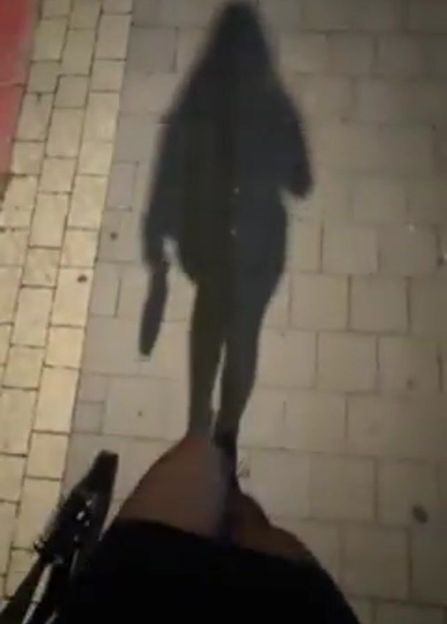 A person wearing a black skirt and sneakers walks across a brick walkway at night. Their shadow is cast in front of them, and they carry a dark object in their hand. The walkway has a pale, gray color, and there's a lighter strip of brick along the left edge. The lighting is dim.