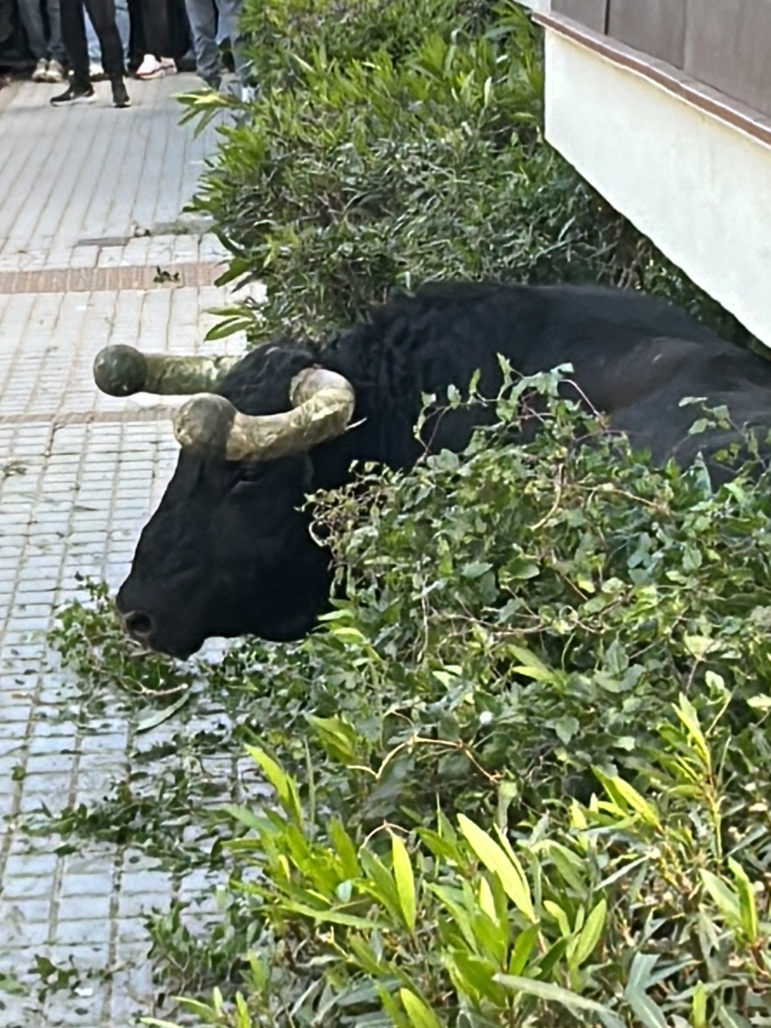 A black bull with large, pale horns is lying down, nestled among leafy bushes adjacent to a paved walkway in what appears to be a public area. The bull is partially obscured by the foliage. The setting is Vejer de la Frontera, Spain. Some people's legs are visible in the background near the walkway. A building is on the right of the bull.