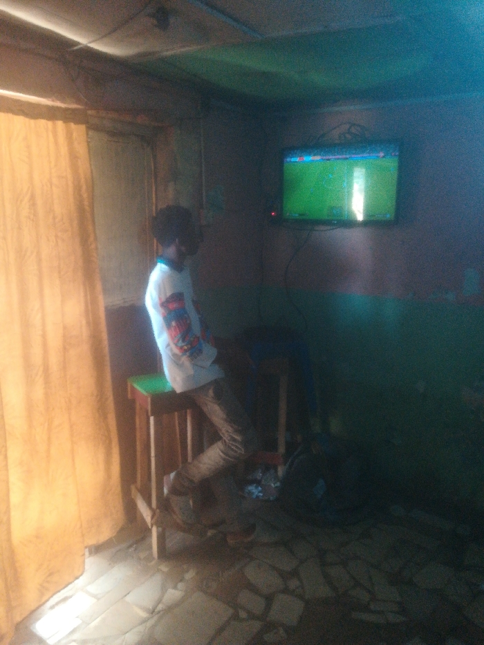 An interior room, presumed to be in Zaria, Nigeria, displays a dim, artificial lighting environment with some natural light entering from the left. A young individual with dark, curly hair is observed from the side, positioned towards the right of the frame, sitting on a wooden stool with a green top. The individual wears a white long-sleeved shirt with multi-colored patterns on the sleeves and dark trousers, with their left foot on the floor and the right foot resting on a stool rung. On the far wall, a flat-screen television is mounted, displaying a football (soccer) match on a green field with player graphics and a vertical bright reflection. A red indicator light is visible on the television's lower right bezel. Electrical wires are exposed on the wall and ceiling above the television. A dark electric fan is partially visible on the floor beneath the television. To the left, a light-brown or ochre-colored curtain hangs, covering a window or doorway, with a rectangular patch of natural light illuminating the lower portion of the curtain and the floor directly beneath it. The floor is composed of irregularly shaped, light-colored tiles or broken concrete pieces. The room walls are painted in two tones: a darker grey/brown on the upper section and a faded green/blue on the lower section. A second wooden stool is partially visible behind the seated individual. Exposed electrical wires are present along the ceiling.