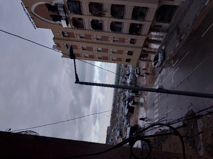 A high-angle view shows a street scene with a tall building on the left. The building has multiple floors with ornate windows and balconies. To the right is a street with a white car parked along the side. People are visible in the distance. The sky is overcast, and power lines stretch across the frame. The perspective is tilted, giving the image a slightly disorienting feel. A dark foreground element with wires obscures the bottom of the frame.