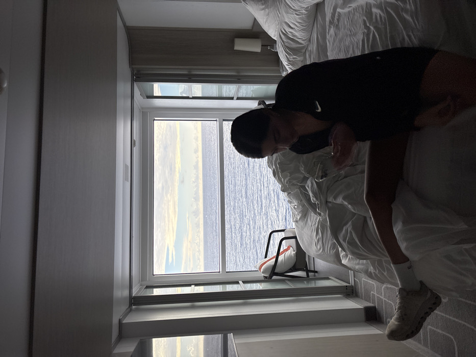 This image depicts the interior of a room with an ocean view, situated in Unknown, Bahamas. A female, with dark hair, is seated on a large, unmade bed in the foreground. She wears a dark long-sleeved top with a white Nike logo on the left chest and light-colored athletic shoes with white socks on her left foot. Her hands hold a mobile phone, at which she is looking down. To the right of the bed is a white headboard and a white table lamp with a rectangular shade. The background features a large, multi-pane window or sliding door system with white frames, offering an unobstructed view of a blue ocean under a partially cloudy sky. An outdoor chair with a dark frame and a white pillow featuring a red stripe is visible on an exterior balcony through the window. The room's floor is covered by a light-colored, patterned carpet, and the ceiling is paneled in a light color. The scene is illuminated by natural light entering from the ocean-facing window.