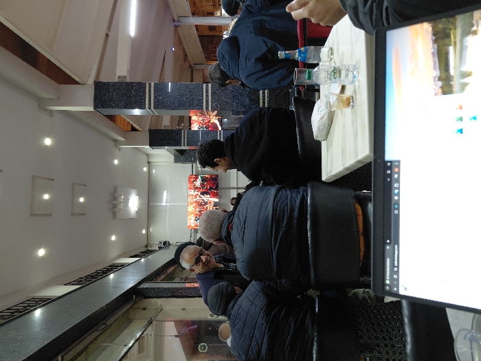A group of people are seated at tables in a brightly lit interior space. The focus is on a table with water bottles and a white napkin, partially obscured by a computer screen. The background reveals a modern-looking space with hanging light fixtures and decorative panels. The people are casually dressed, some in dark jackets. Digital displays showing colorful content hang on the walls in the background.