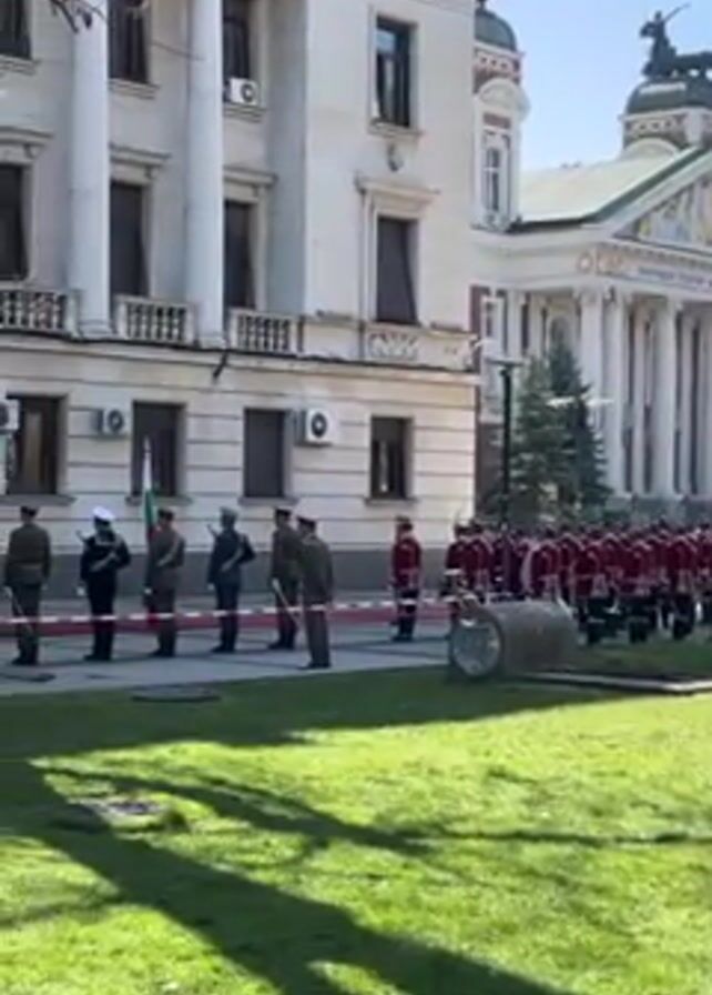 solemn scene with a military honor guard and marching band performing in front of a building. In the foreground, a grassy area with trees partially obscures the view. The honor guard, dressed in various military uniforms, stands in formation. Some members are carrying rifles, while others appear to be officers. Behind them, the marching band, adorned in red uniforms, is visible. The band members are holding instruments and standing in an organized formation, ready to perform. The building in the backdrop is a grand structure with classical architecture, featuring white columns and a stately appearance. It is likely a government or official building, adding to the formality of the event. The sky is clear and sunny, creating a bright ambiance for the scene. Overall, the video captures a formal and respectful military ceremony, with uniformed personnel, a marching band, and a distinguished building as the backdrop. The scene exudes a sense of order and solemnity.