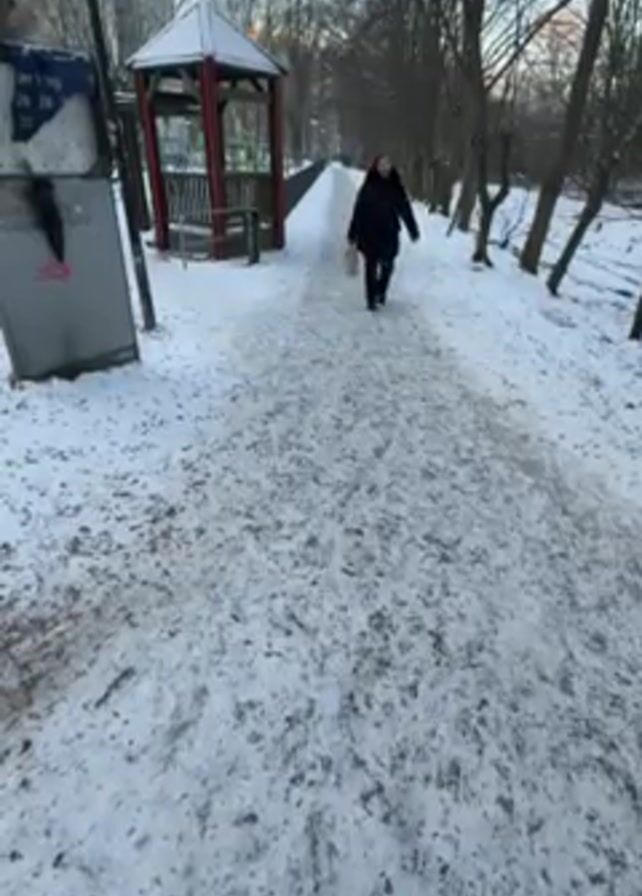 The video is taken from the perspective of someone riding a bicycle down a snow-covered path. A woman in a black coat walks toward the camera, carrying a brown paper bag in her right hand. She is the only person clearly visible. To the left of the path is a metal utility box with a sign and a red and white gazebo. Trees line the right side of the path, and snow covers the ground on either side of the path. A tall building is visible in the background on the left. The bike is moving forward along the snowy path.