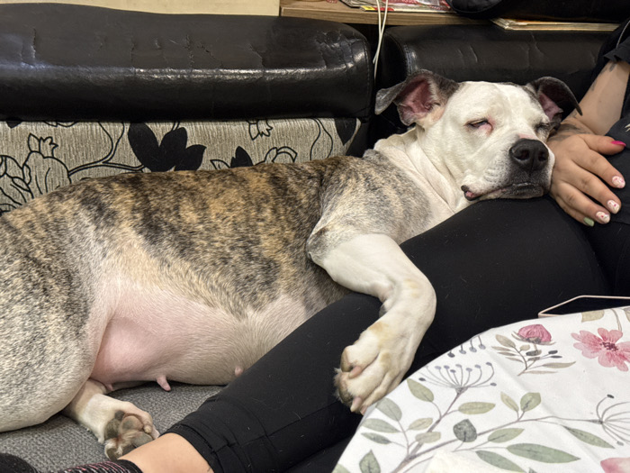 An indoor scene depicts a brindle and white dog, possibly an American Staffordshire Terrier or similar breed, asleep on a sofa. The dog's head, predominantly white with dark markings around the ears and eyes, rests on the lap of an unseen individual, whose legs are clad in black leggings. The dog's eyes are closed. Its body exhibits a brindle pattern on a lighter background, transitioning to a white chest and belly, where multiple visible teats indicate it is likely a female. One of the dog's front paws extends onto the person's leg. A hand, adorned with painted fingernails featuring light colors and subtle designs, rests on the dog's neck. The sofa features dark, possibly worn, upholstered sections and cushions with a patterned fabric displaying dark floral or leaf motifs on a lighter ground. A floral-patterned blanket or throw, with pink and green elements on a white background, is partially visible in the lower right foreground. The observed location is within a residential setting in Sofia, Bulgaria.