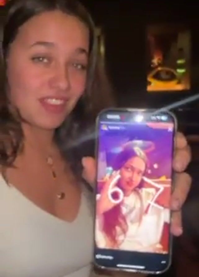 A woman with curly brown hair holds up her phone, showing a photo of another woman on the screen with the number "67" superimposed over the image