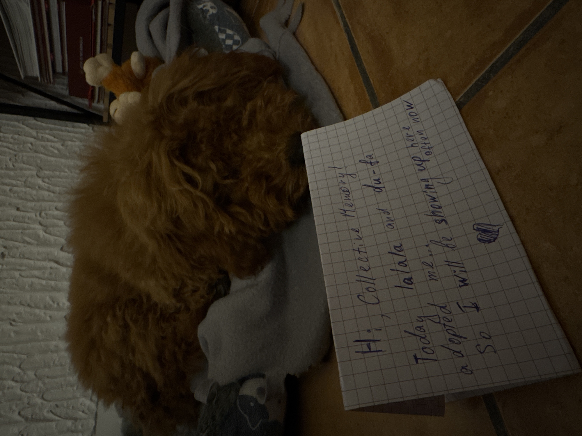 An indoor residential scene, presumed to be located in Sutomore, Montenegro, is depicted. A small, reddish-brown, curly-haired dog is observed sleeping curled up on a grey pet bed or blanket. A small, orange and white stuffed animal is positioned near the dog's head. In the foreground, a white, grid-lined paper note stands upright, displaying handwritten text in blue ink that states: "Hi, Collective Memory! Today lalala and du-da adopted me... So I will be showing up here often now," followed by a drawn blue heart. The floor is composed of light brown tiles with dark grout lines. In the background, a textured white wall with vertical ridges is visible on the left, and a dark shelf with a stack of books with white and red spines is present on the right. The overall lighting is dim.