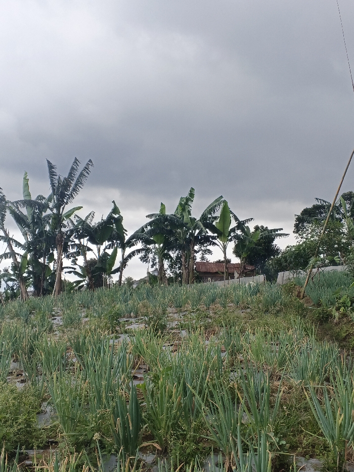 The scene is an agricultural landscape in the city of Ngọc Tụ, Vietnam, viewed under a uniformly overcast grey sky. The foreground comprises a cultivated field containing dense rows of green, upright plants, consistent with scallions or spring onions. The ground directly beneath these plants is partially covered with white plastic sheeting, serving as mulch, with some uncontrolled vegetation visible between rows. In the midground, several banana trees with large, green, sometimes tattered leaves are prominent. Further in the background, a small structure with a reddish-brown roof, possibly a residential dwelling or outbuilding, is partially visible among additional trees. A slender, light-colored pole, likely bamboo, extends vertically from the lower right quadrant of the image. No human subjects, animals, or observable actions are present.
