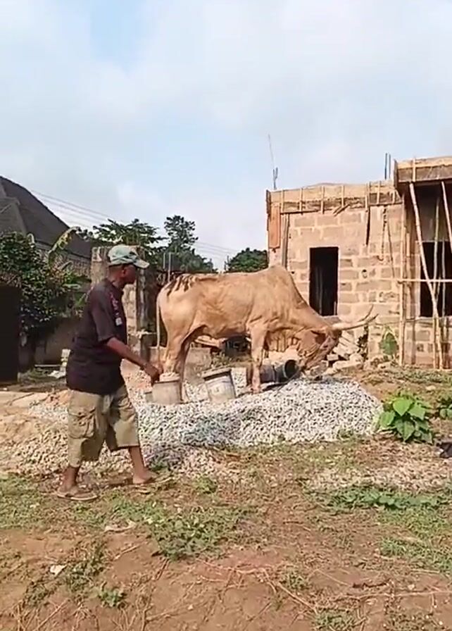 large brown bull standing on a pile of gravel in front of an unfinished brick building. A man wearing a brown shirt, khaki shorts, and a baseball cap walks past the bull. Another man is standing on the roof of the building. The scene appears to be a construction site with dirt ground in the foreground and other houses in the background. The sky is partly cloudy.