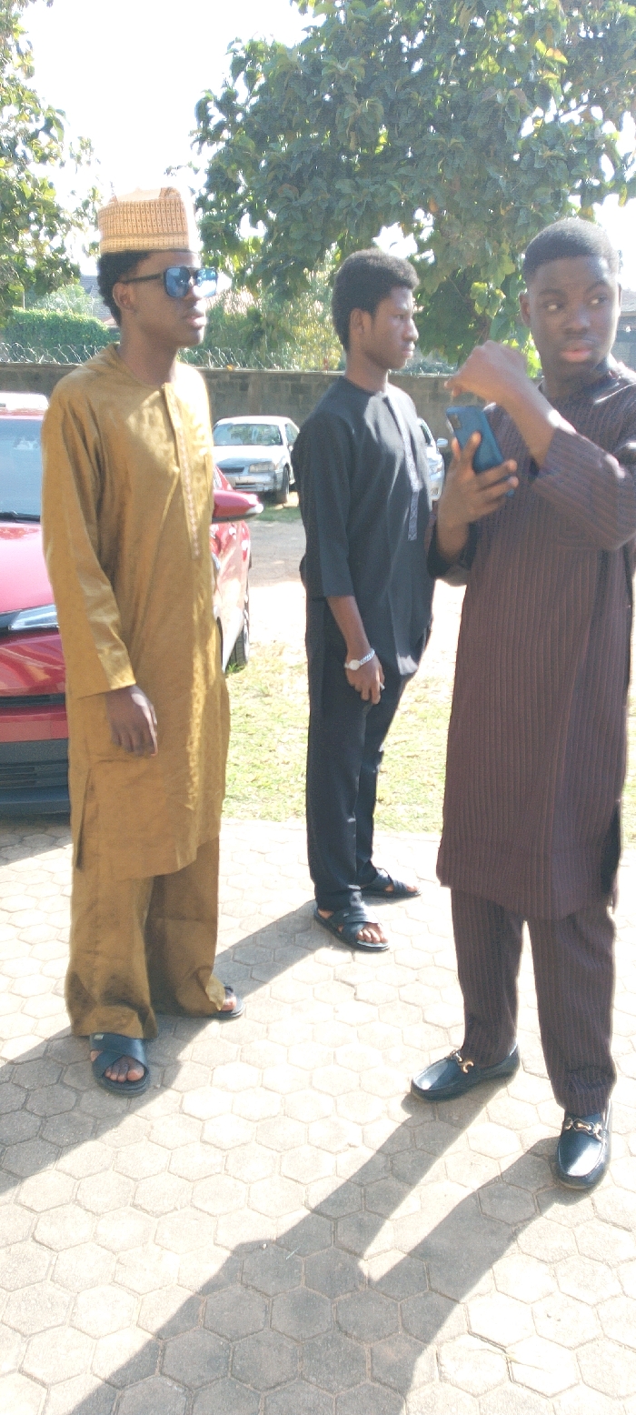 Three African males are depicted standing outdoors on a light-colored hexagonal paver surface under bright sunlight, casting elongated shadows. The leftmost individual wears a golden-brown long-sleeved tunic and trousers, a patterned light-brown cap, and dark sunglasses, with dark sandals. The middle individual wears a dark long-sleeved tunic and trousers, dark sandals, and a silver-colored wrist watch; he stands slightly behind the first. The rightmost individual, in a dark brown vertically striped tunic and trousers with dark loafers, holds a dark blue smartphone with both hands at chest level. All three individuals face generally right. A red vehicle is partially visible behind the leftmost person, and a white vehicle is parked further back on a grassy patch. Lush green trees and a low wall topped with barbed wire are visible in the background. The precise location within Kubwa, Nigeria, is not identifiable from the image.