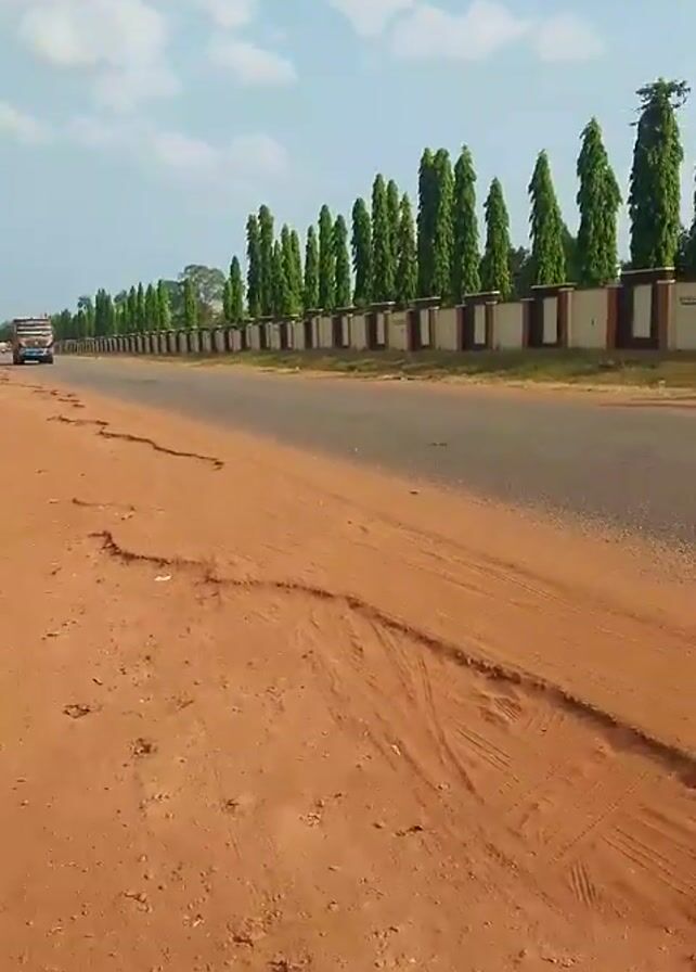 The video depicts a rural scene with a two-lane paved road running horizontally across the frame. On the left side of the road, there's a wide, unpaved shoulder covered in reddish-brown dirt. On the shoulder, partially assembled wooden furniture, including bed frames and headboards, are displayed. Adjacent to the road on the right is a wall interspersed with tall, slender evergreen trees planted at regular intervals. In the distance, a truck is driving along the road, heading towards the viewer. The sky is blue with scattered clouds. A building is partially visible in the background. The camera is static, capturing the scene from a low angle. Tire tracks are visible in the dirt on the shoulder.