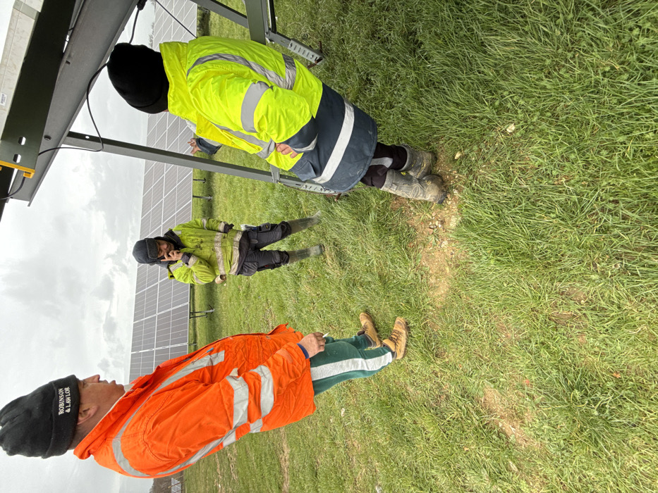 An outdoor scene at a solar farm in Southampton, United Kingdom, is depicted under an overcast sky
