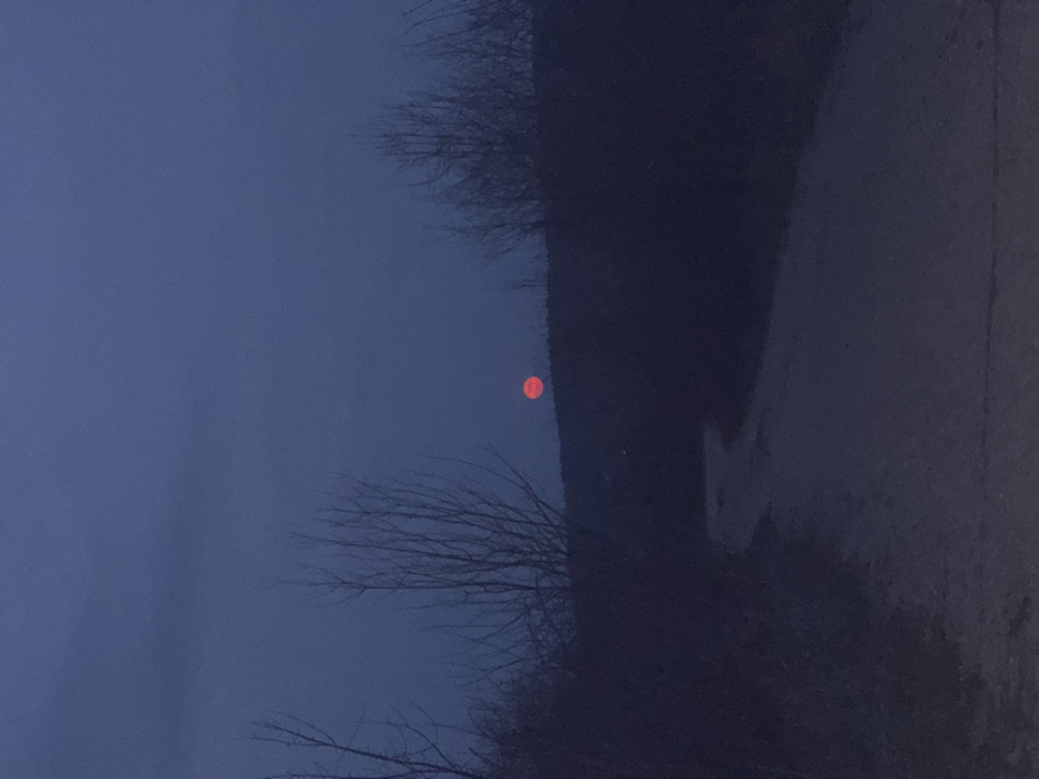 The scene depicts an unpopulated outdoor environment in Bistritsa, Bulgaria, observed at twilight or night. A prominent, circular, bright red celestial object, consistent with a moon or setting/rising sun, is visible on the horizon, centered slightly to the right. The sky overhead is dark blue-gray, displaying indistinct cloud formations. A light-colored, unpaved path traverses the lower half of the frame, originating from the bottom center and curving towards the midground, then veering left. Dense, dark vegetation, primarily bare deciduous trees and shrubs, flanks both sides of the path and forms a low, dark horizon line behind which the celestial object appears. No individuals, man-made structures beyond the path, or specific actions are depicted.