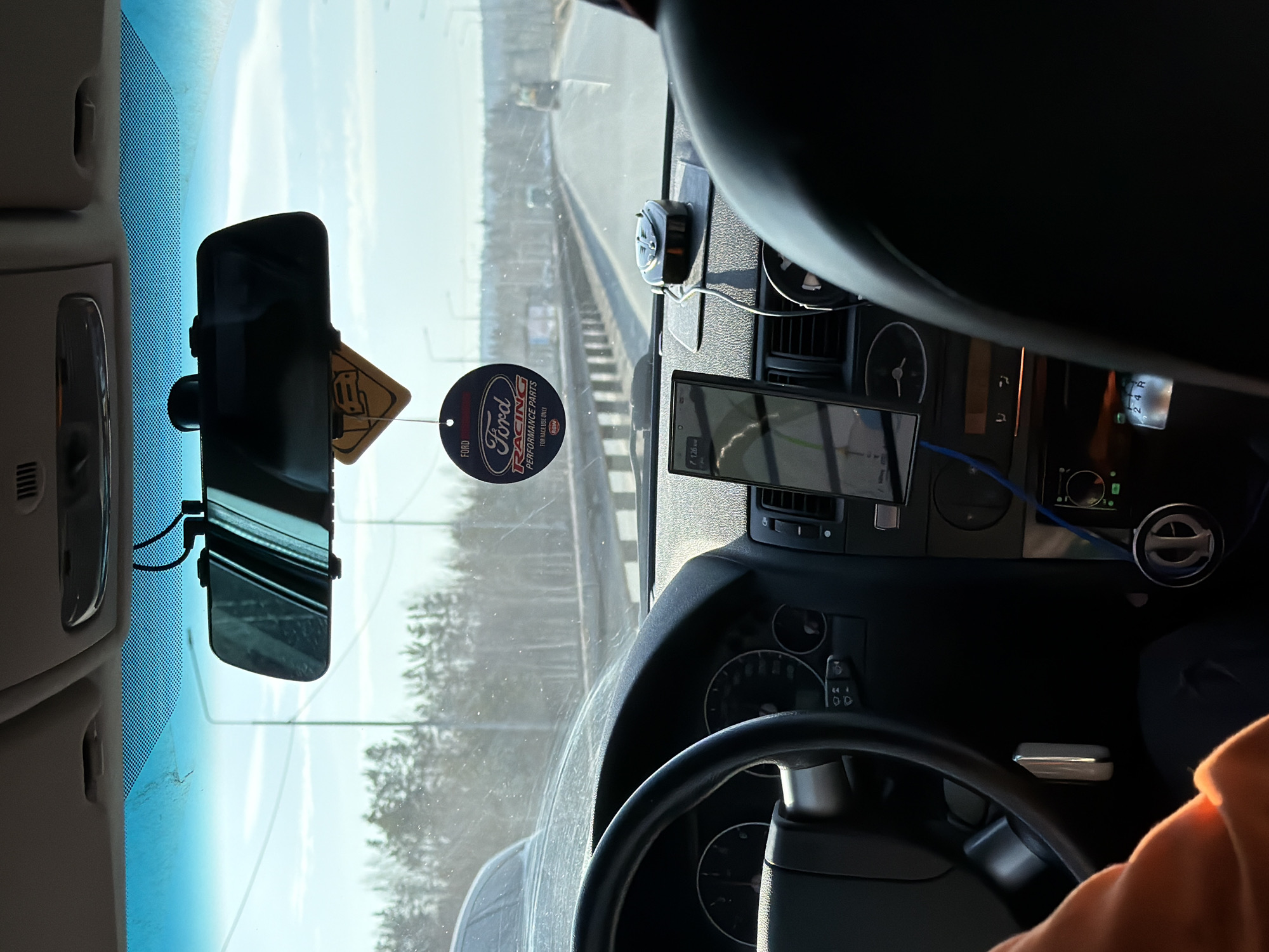 The image provides a first-person perspective from inside a vehicle, looking forward through the windshield onto a road in Revda, Russia. The lower-left foreground shows the partial view of a person's right arm and left leg, clad in an orange sleeve. A black steering wheel with a silver central element occupies the left side of the frame. The dark dashboard features an instrument cluster visible behind the steering wheel, a centrally mounted smartphone displaying a navigation application, and a small black electronic device with a visible wire on the right side of the dashboard. Two air fresheners hang from the rearview mirror: a yellow triangular one with a vehicle icon and a circular blue one branded "Ford Racing Performance Parts." The rearview mirror unit is black and has visible wiring on its upper edge. Below the dashboard, a manual gear shifter marked "2 4 R" is visible in the lower right, alongside an aftermarket single-DIN stereo head unit with blue illuminated controls. The windshield is noticeably dusty and smudged. Through the windshield, a multi-lane asphalt road extends into the distance. The vehicle appears to be on a bridge or overpass, indicated by metal guardrails lining both sides of the roadway. A line of trees, appearing bare or with minimal foliage, is visible beyond the road, particularly on the left, under a clear, bright blue sky with some atmospheric haze. Several vehicles are discernible in the distance on the road, including what appears to be a larger truck or construction vehicle further ahead. Streetlights or utility poles are intermittently visible along the roadside.