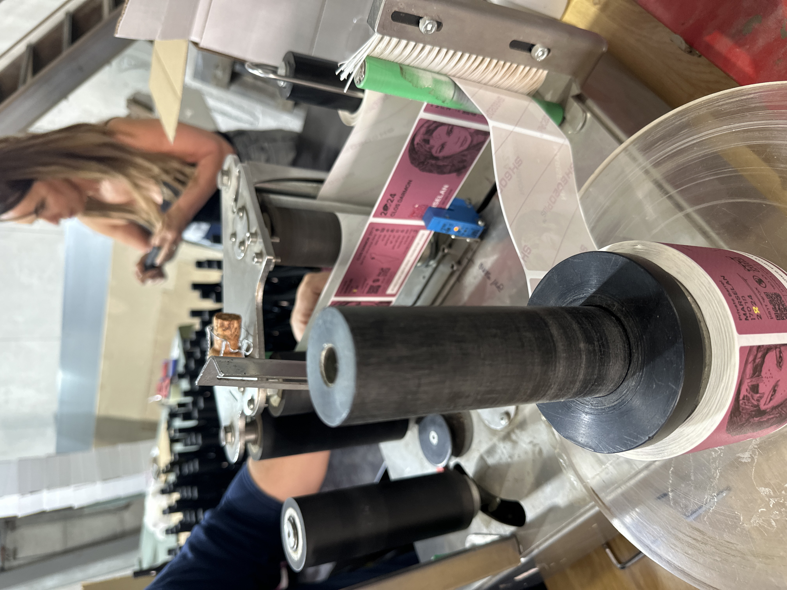 The image displays an indoor industrial or workshop setting in Tira, Israel, focused on a product labeling operation. In the immediate foreground, a roll of self-adhesive labels, predominantly pink/magenta, is loaded onto a semi-automatic labeling machine. Each label features the text "Private Barrel MARSELAN", "17010", "2024", a QR code, and an illustration of a woman's face with a head covering. The labeling machine occupies the midground, consisting of black rollers, metallic components, a green brush-like guide, and a blue optical sensor with an illuminated orange indicator light. A transparent label backing is visible as it separates from the applied labels. To the left, a person's arm, dressed in a dark blue long-sleeved shirt, is positioned near the machine, indicating active engagement with the equipment. In the blurred background, a woman with long brown hair, wearing a dark top, is visible to the right, appearing to handle or observe an object. Behind her, a metal staircase and parts of open cardboard boxes are present. To the left background, numerous dark-colored bottles are arranged on a surface, suggesting they are the items undergoing the labeling process.