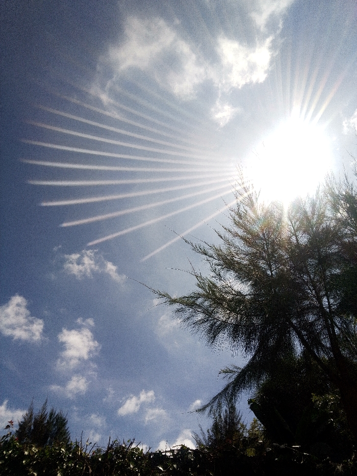 The image presents an upward-angled view of an outdoor scene in Nachu ward, Kenya. A brilliant sun is positioned in the upper right quadrant, emitting multiple distinct light rays that extend diagonally across the blue sky towards the upper left. The sky features scattered white cumulus clouds. The lower half and right side of the frame are occupied by dense, dark green to black silhouetted foliage and tree branches, which are heavily backlit by the intense sunlight. No individuals or specific man-made objects are visible.