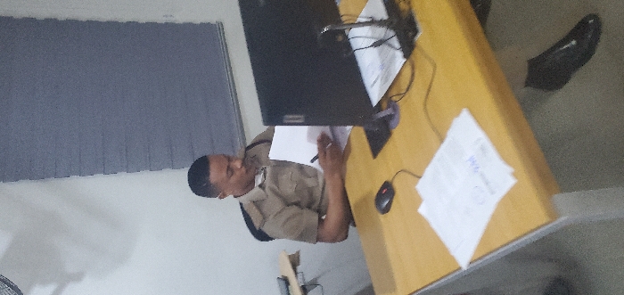 An adult male is seated at a light wooden desk inside an office in Falomo, Nigeria. He wears a light brown, short-sleeved uniform shirt with epaulets. The man is holding a white document in his left hand and a black pen in his right, appearing to write or review the document. A black computer monitor is positioned on the desk directly in front of him, with a black wired computer mouse to its left. Several white papers are present on the desk, both near the monitor and in a stack in the lower-left foreground. A black office chair supports him. In the background, a light-colored wall is visible, along with a grey horizontal blind covering an upper section. A portion of a smaller, lighter-colored table is visible to the left of the main desk. A black dress shoe is visible on the light-colored floor beneath the desk.