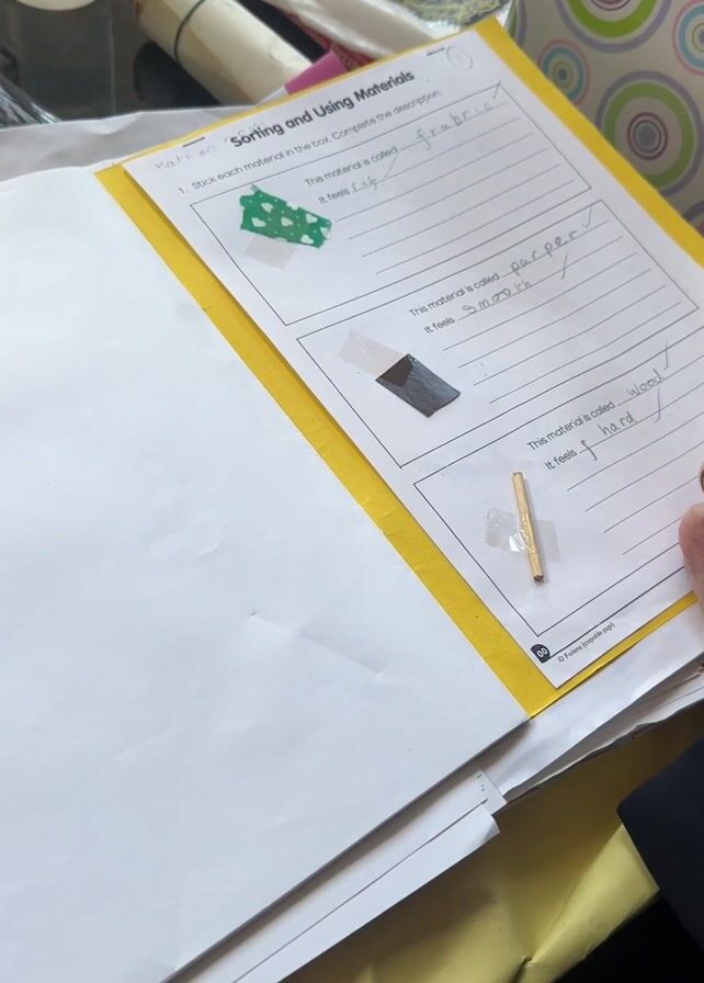 A woman’s hand is pointing to a “Sorting and Using Materials” worksheet in a yellow folder, which is opened to a white page