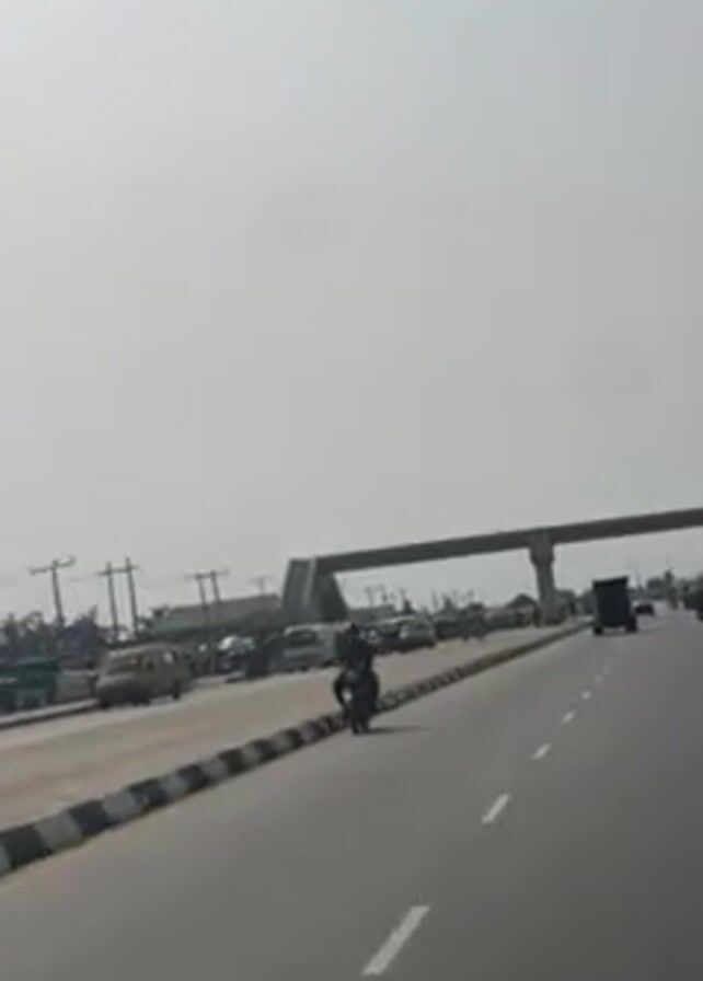 road with traffic on both sides. On one side of the road, there are several cars and vans stopped. There are also some people standing around near the vehicles. On the other side of the road, a few cars and a motorcycle are driving. There is an overpass above the road. The sky is overcast and the horizon is hazy.