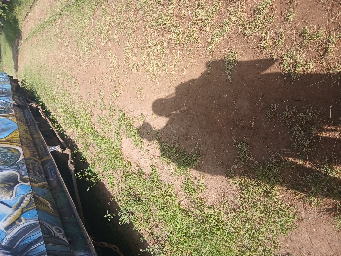 A ground-level perspective reveals a scene with varied textures. To the left, a section of a colorfully painted structure is visible, connected to the ground by a metal chain. The ground itself consists of exposed dirt intermixed with sporadic patches of green grass. A prominent shadow cast by an individual falls across this terrain, adding depth to the image.