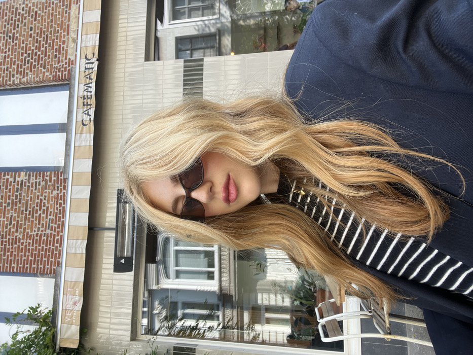 - "The image is a waist-up portrait of an individual with long, wavy blonde hair, dark oval sunglasses, and pink lipstick" by FM-VYYYD2, licensed under CC BY 4.0