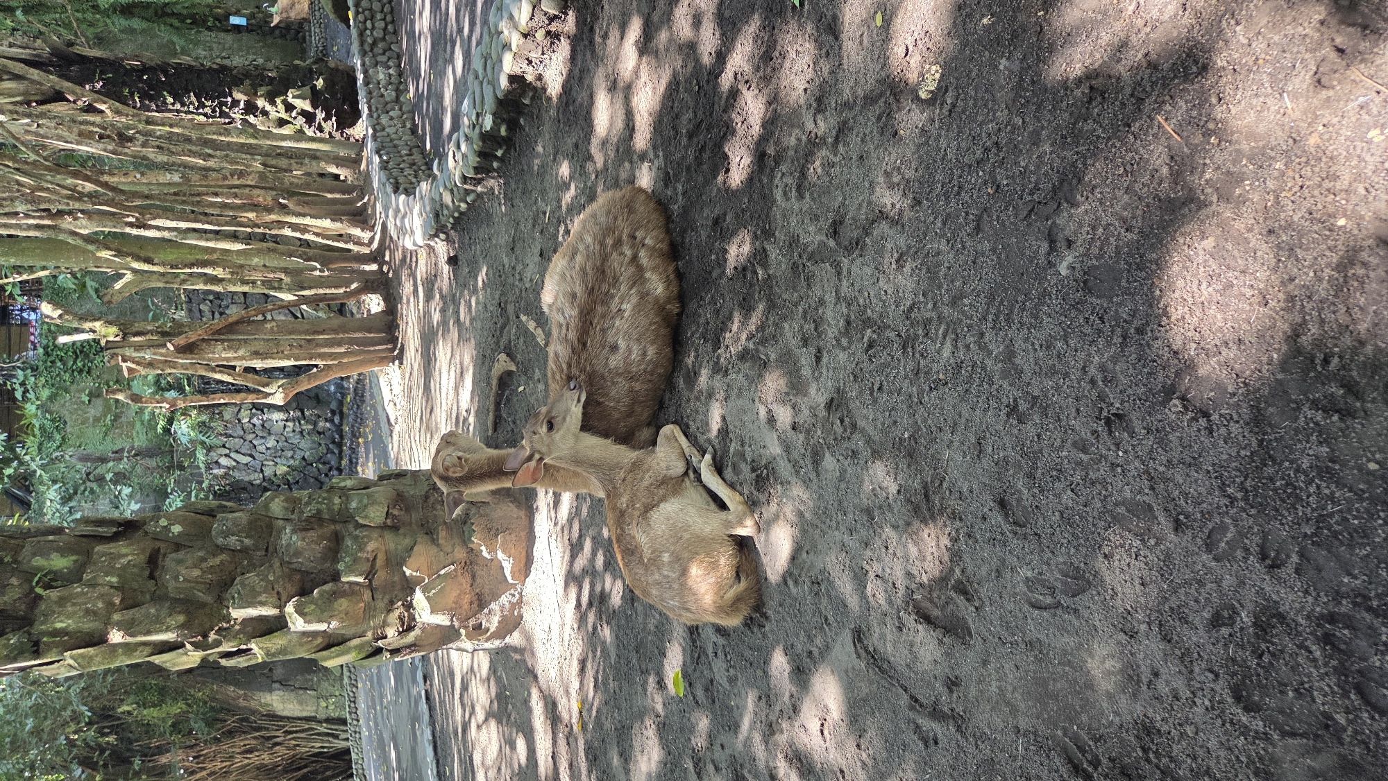 A ground-level, eye-level shot reveals two deer resting in a sandy enclosure within Celuk, Indonesia. The sandy ground is dappled with shadows from overhead trees. The deer are light brown. One deer is lying down, curled up, with its head partially obscured by the other deer, which is also lying down but oriented in a different direction. To the left of the deer, the textured trunk of a palm tree is visible. Behind the deer, there is a barrier constructed of sticks and stones.