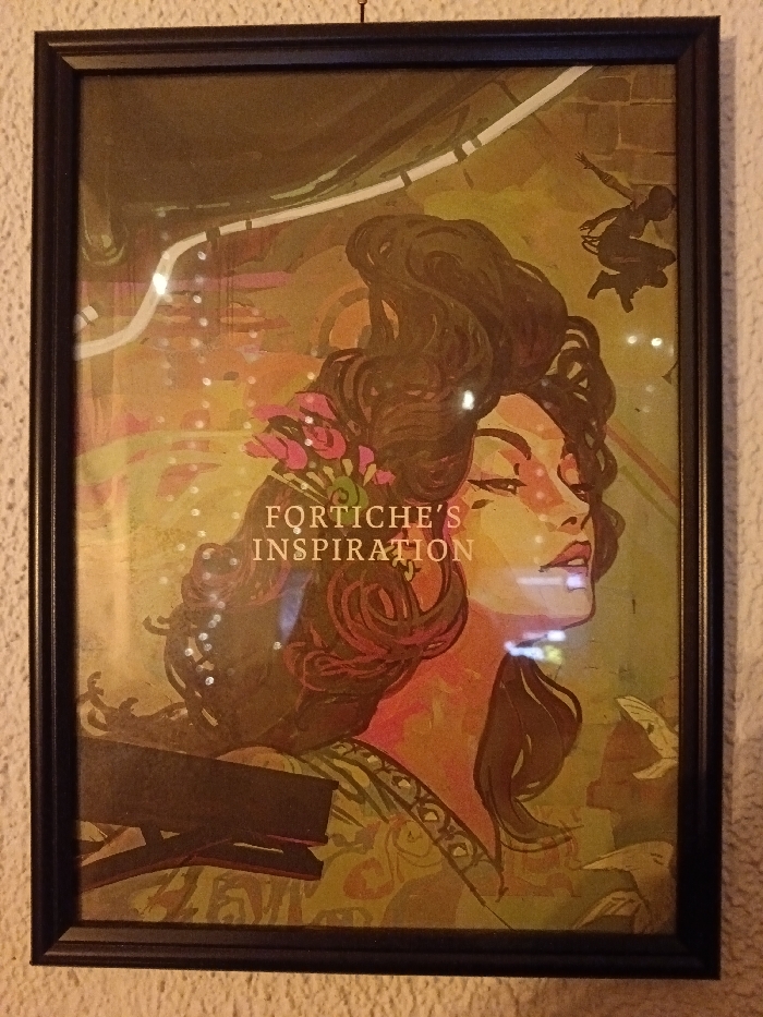 A framed artwork hangs on a wall. The artwork features a woman with elaborate dark hair, adorned with flowers, and a classical profile. Above her head are the words "FORTICHE'S INSPIRATION". In the background, there are abstract shapes and a silhouette of a figure in motion. The lower portion of the artwork shows a stylized, possibly architectural, design in dark colors. Light reflections are visible on the glass covering the artwork. The frame is a simple, dark design.