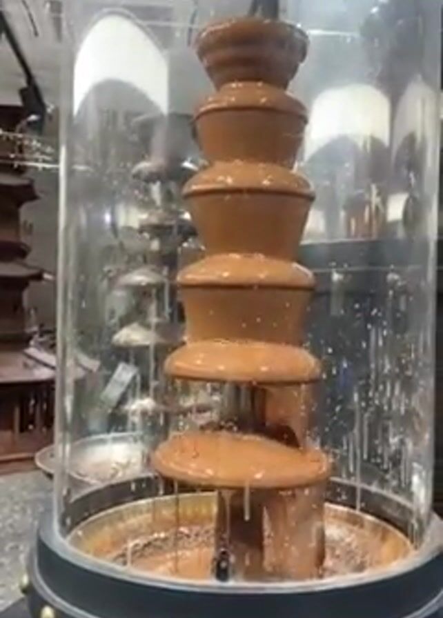 - "cascading chocolate fountain enclosed in a clear cylindrical casing" by FM-R7dQ13, licensed under CC BY 4.0