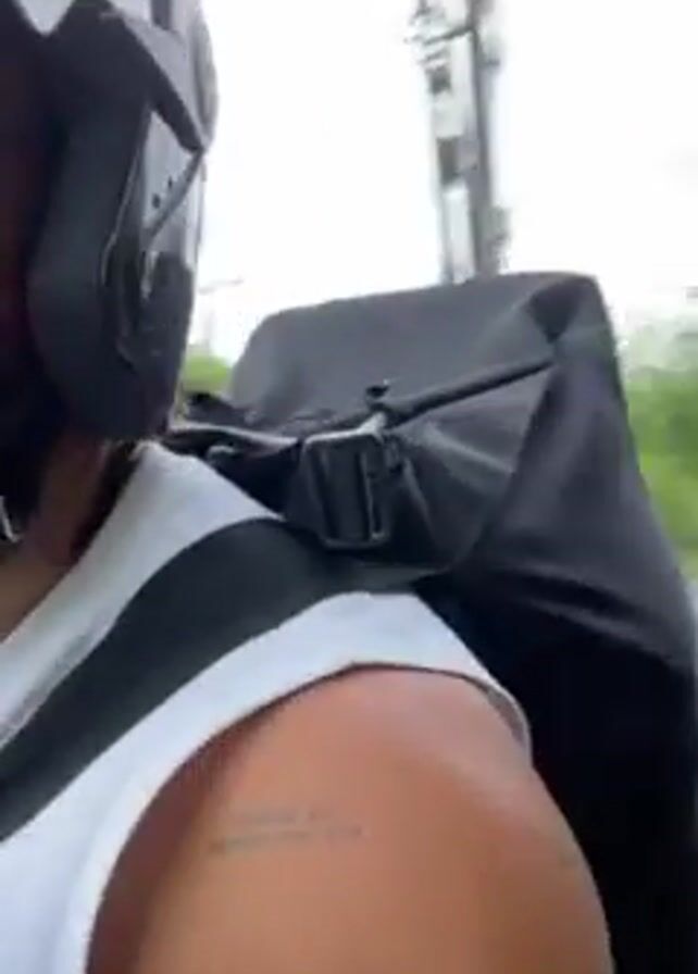 A man is riding a scooter on a winding road. He is wearing a black helmet with a clear visor, small round sunglasses, and a white tank top. He has a beard and long hair. He is carrying a large black backpack and has a light green suitcase strapped to the front of the scooter. The road is surrounded by green trees and hills. The sky is overcast.