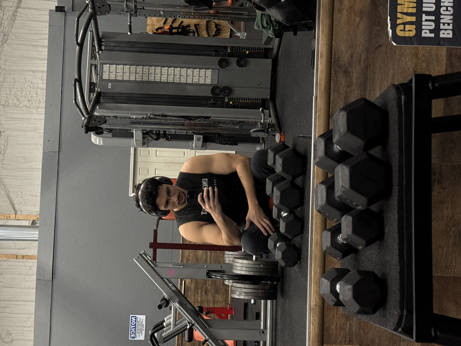 A man wearing headphones is reflected in a gym mirror, holding a phone. He is kneeling next to a rack of dumbbells. To his left, gym equipment is visible. Weight plates are on a rack on the floor next to the man. The rack of dumbbells is on the right side of the mirror, slightly out of focus. A sign that says "GYM RULES PUT UP BENCH" is partially visible.
