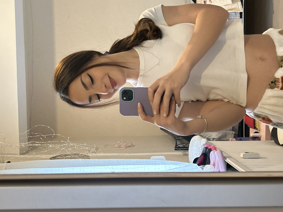 A female individual is depicted in a selfie taken in a mirror within an indoor setting in Strasbourg, France. She has medium-brown hair styled in a low ponytail with strands framing her face. Her eyes are directed downwards, and her lips, colored with a brownish-red lipstick, show a gentle smile. She wears a white, short-sleeved crop top, revealing her midriff, and light-colored pajama bottoms adorned with cartoon animal patterns, specifically bears wearing scarves. A silver-colored necklace with a rectangular pendant is visible around her neck, and a silver-colored bracelet with a spherical charm is on her left wrist. She holds a smartphone, encased in a lavender-colored case, with both hands to capture her reflection. The background, visible in the mirror, includes a light-colored wall, a white ceiling, and string lights hanging on the left side of the frame. A white sheer curtain is also visible on the left, along with a white, possibly furry, object and a pair of pink slippers on a lower surface. A dark headboard or piece of furniture is partially visible behind her left arm. Further right, folded clothing or laundry is discernible on a shelf or surface, alongside a dark bottle with a purple cap and other small items.
