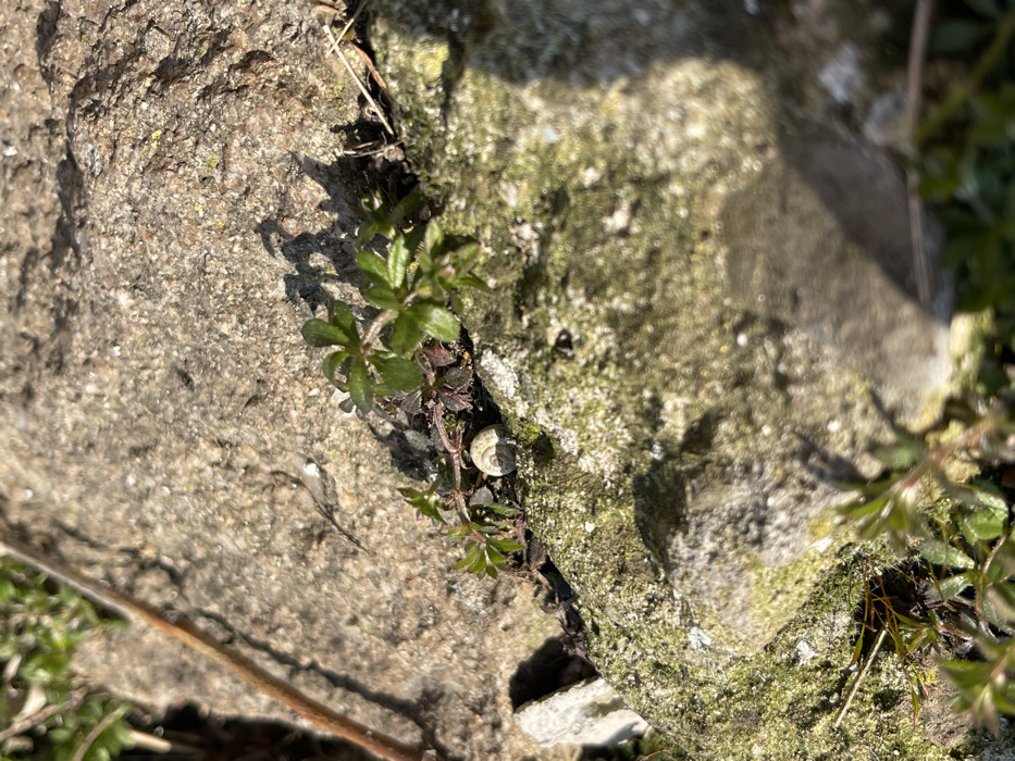 A close-up view depicts a static outdoor scene in the city of Bulgarovo, Bulgaria. The central focus is a small, pale, spiraled snail shell nestled amongst green foliage between two large, rough-textured stones. The upper stone, occupying the upper-left and central background, is light brown to grey with visible granular texture and scattered small yellowish-green patches, likely lichen. A thin, reddish-brown stem extends diagonally upwards on the left side of this stone. The lower stone, positioned in the foreground and lower-right, is heavily covered with bright green moss and some scattered white specks. Small plants with five-lobed green leaves, intermingled with reddish-brown stems and dark organic matter, grow in the crevice between the two stones, with one cluster directly adjacent to the snail shell. Direct sunlight illuminates the scene from the upper left, casting distinct shadows from the foliage and elements onto the upper stone, and a broader shadow partially obscures the lower right portion of the image. No people are present, and no active interactions or actions are depicted.